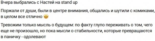 Казалось бы, грех жаловаться, но Луковкин после свидания опять задумался о будущем, при этом, сам пишет, что будущее ещё не наступило и глупо тревожиться. Или есть всё-таки у Дмитрия опасения, что он не может найти общий язык с участниками Дома-2 и настроил против себя целую коалицию, скрывая правду про договоренности с Настей? Какая стабильность, если за периметром работы нет, а проект он может потерять? Вдобавок ничего не приобрел за несколько месяцев на телешоу, кроме чемодана без ручки.