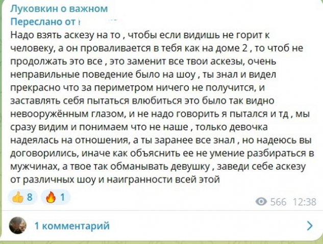 Луковкин часто говорил про спорт, здоровый образ жизни и путешествия, а на деле - в оковах пороков. Поэтому заявил в своём блоге, что берет аскезу, в первую очередь, от потери времени на сайтах знакомств. А потом и от других зависимостей решил избавиться. И тут ему дамы, которые подписались, чтобы наблюдать за парой Димы и Настей Филипповой, начали говорить, что аскеза у него от отношений. Дима отправил одну из таких подписчиц лесом и поймал такой кураж, что начал незнакомой женщине претензии предъявлять.